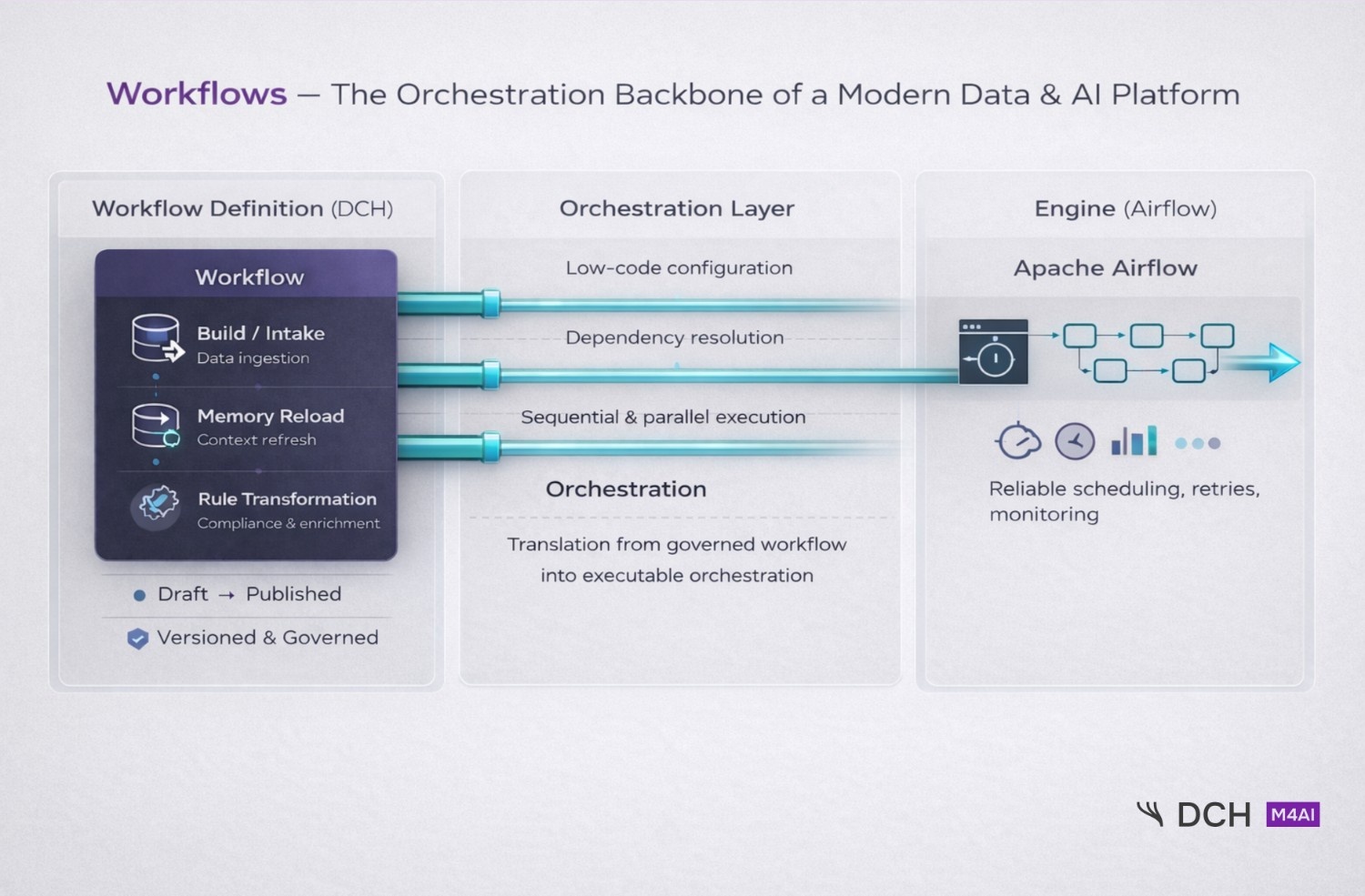 While DCH defines and governs workflows, execution itself is handled by a proven engine: Apache Airflow 3.1.